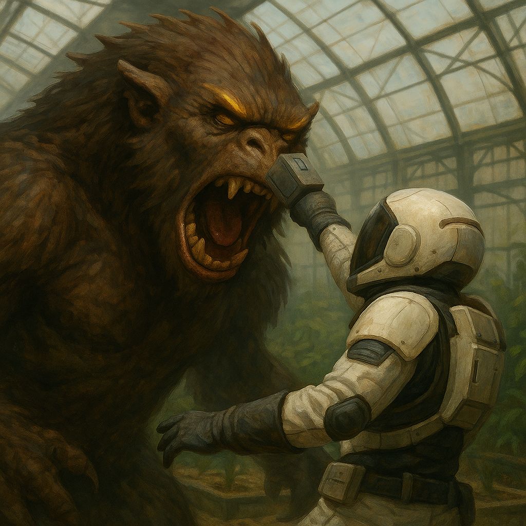 “Nope!” Lira spun and sprinted, suit squeaking. “Absolutely not! I’m not paid enough for carnivorous cucumbers!”